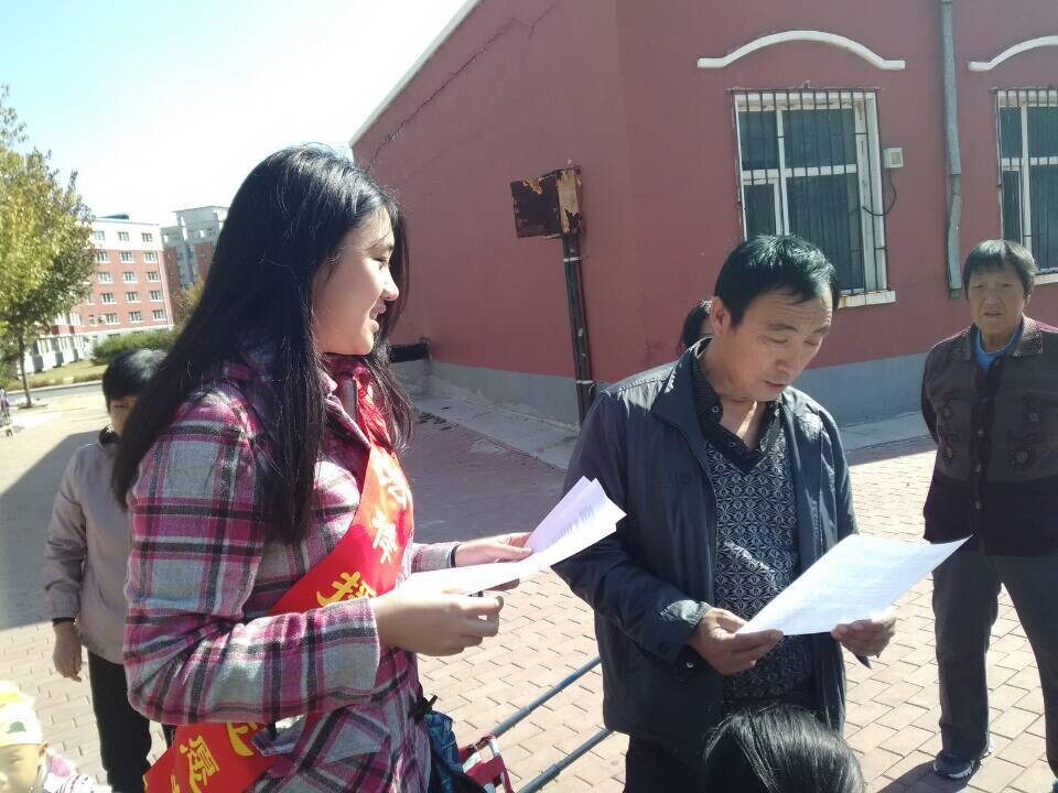 西侧的三佳社区。本次活动分为以下两个环节,首先队员们来到小区内进行普法宣传,主要为居民委员会的选举和职权的有关内容,旨在提高居民参与公共事物的热情和信心。全体队员共同参与并耐心的回答居民们的问题,对于队员们的翔实解答,小区居民们十分满意。除此之外,本次法律援助活动还走进居民的家中开展针对性活动,但是由于十一期间小区的人数较少,这项任务的难度较大。尽管如此,全体队员们通力协作,仍取得了很好的效果。