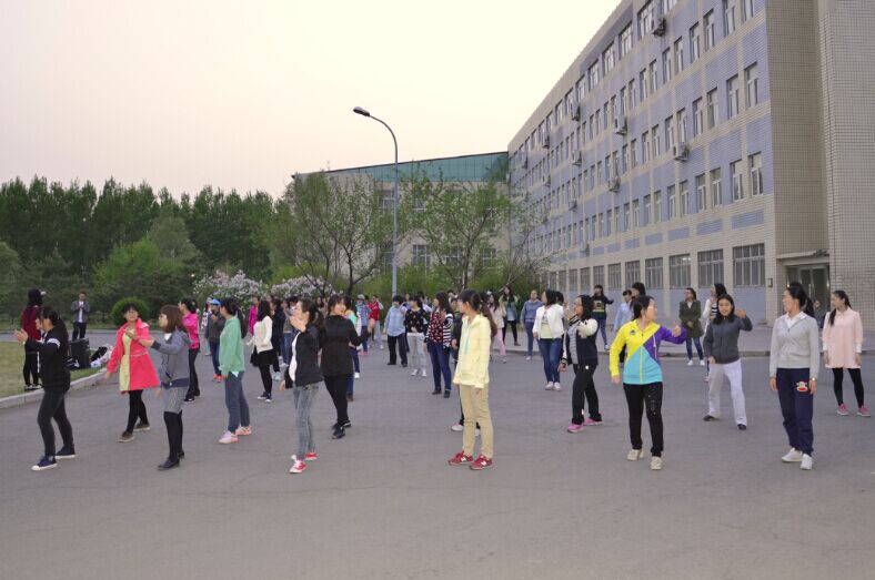 2013级女生在经信教学楼楼下展开了运动会集体项目之一太极拳的第一次排练。