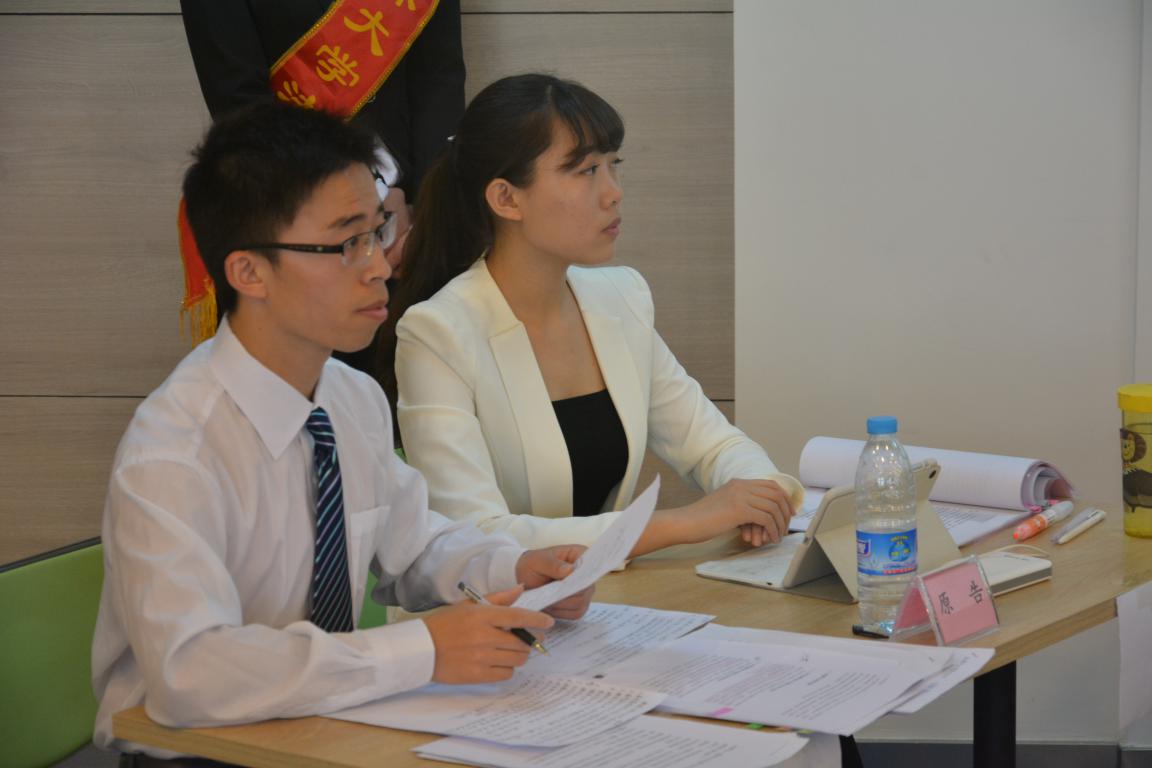 上午8:30,半决赛第一场拉开帷幕,原告熊猫特攻队与被告木石队在经信教学楼二楼D区进行了激烈的较量,本场比赛由李丽娟担任审判长,并同两位审判员——李立丰、梁伟组成合议庭。比赛开始后,首先由原告方宣读其代理意见,原告认为其当事人赵丹与被告签订合同构成表见代理,要求返还购车款十万元并支付相应利息,且诉讼费用由被告方承担。被告方也发表了自己的答辩意见,认为其一原告与被告的表见代理并不成立,其二原告赵丹已作为姜丹诈骗案的受害人接受了一部分补偿,不应再请求赔偿了。随后,合议庭总结了双方争议焦点,即表见代理成立与否和赵丹既已接受刑事案的补偿是否还应再请求民事赔偿。