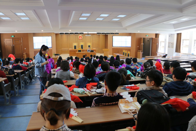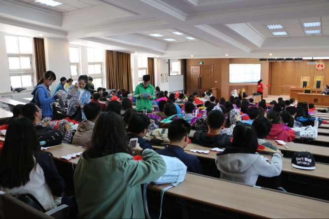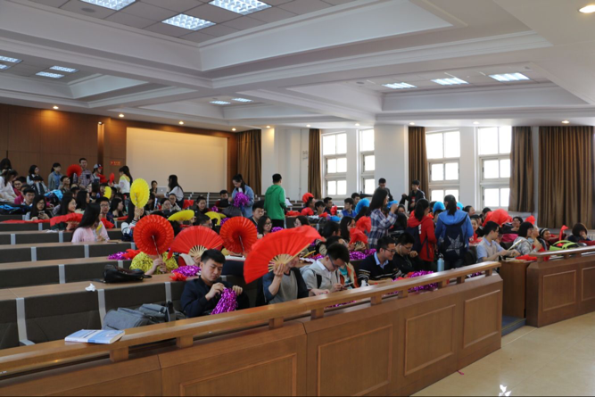 培训开始之前,由工作人员发放观众在运动会当天所需的三种道具道具,分别是扇子、手拉花和拉花。生管会负责人布置了接下来三次训练的时间、地点和要求。12点整,培训正式开始。动作共分为三组,每组由不同的工作人员进行讲解。首先是扇子部分,动作较为复杂,需要同学们集中注意力,默契地完成。第一、二、三个半八拍分别由第一二列、三四列、五六列从左至右将扇子打开。第四个半八拍时第七到十三排抖动扇子,其他排将扇子反方向收起。第五个半八拍时第一到六排和第十四到十八排把扇子打开,全体同学一起抖动扇子,最后将扇子从右至左收起。接着是手拉花部分,这部分共有三个动作:一,统一用右手逆时针打开;二,举到头顶;三,收回胸前。动作虽然较为简单,但在大家整齐划一的配合下效果却极佳。最后是拉花组,拉花组共分为两组,前九排手拿粉色拉花,开始时将拉花放在胸前,然后举过头顶,交替进行一个八拍,同时喊口号“宪刑民商,法院荣光”;第二个八拍是后九排手拿白色拉花做和前九排相同的动作,同时喊口号“纵横四海,威震八方”。第三个八拍全体将拉花放在胸前,接着将拉花举到头顶右上方,再收回胸前,最后举到头顶左上方,这套动作重复两个八拍并重复前两句口号。整齐的动作,嘹亮的口号无不彰显了吉大法律人饱满的精神面貌和高涨的士气。