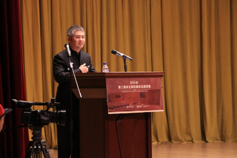 选手代表发言结束后,来自吉林功承律师事务所的仲雷律师代表赛事评委致辞。仲律师表示很荣幸担任此次大赛的评委,同时对为此次比赛付出的所有人员表示最衷心的敬意。