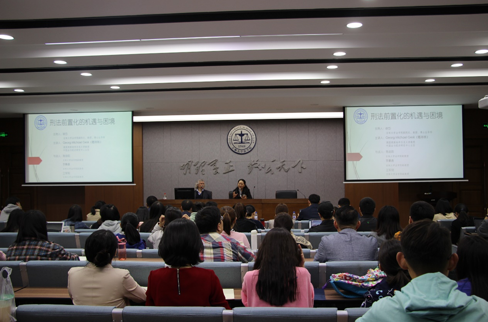 随后,李綦通副教授、王军明副教授、陈劲阳副教授作为与谈人,针对刑法前置化问题发表了各自的见解,也获得了Gesk教授的回应。陈劲阳副教授主持了其后的互动环节,徐岱教授、王弘宁副教授、王若思以及部分研究生对Gesk教授所讲内容提问,Gesk教授针对老师和同学们提出的“基于刑法前置化理论在普通犯罪中是不是有刑法和行政法界限的问题”、“关于刑法前置和法益保护的限制功能”、“预防功能在现今德国是规范中明确规定还是一种学理导向”等问题进行了耐心解答。