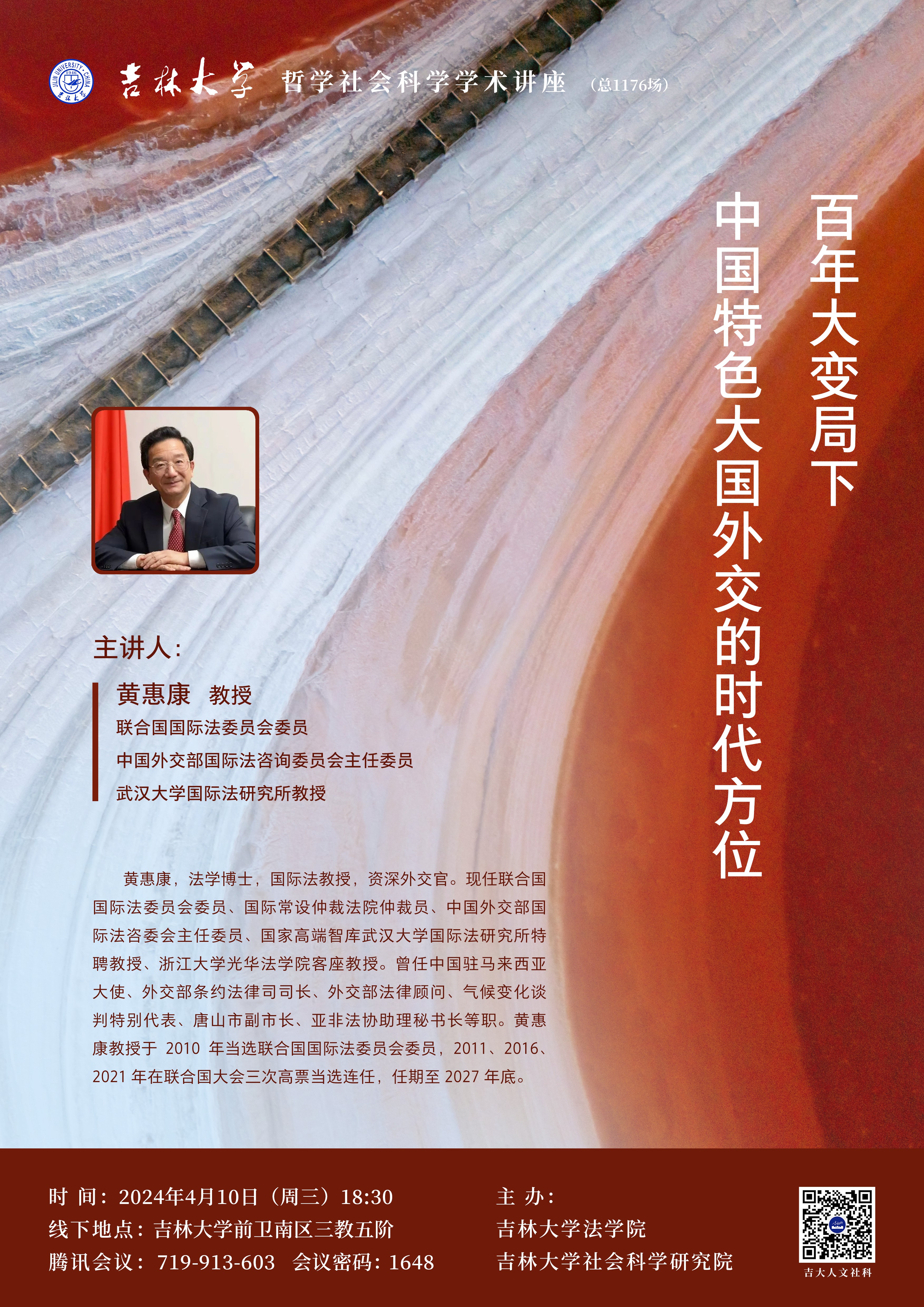 2024年4月10日晚18:30,联合国国际法委员会委员、中国外交部国际法咨询委员会主任委员、武汉大学国际法研究所黄惠康教授将带来“百年大变局下中国特色大国外交的时代方位”主题讲座。