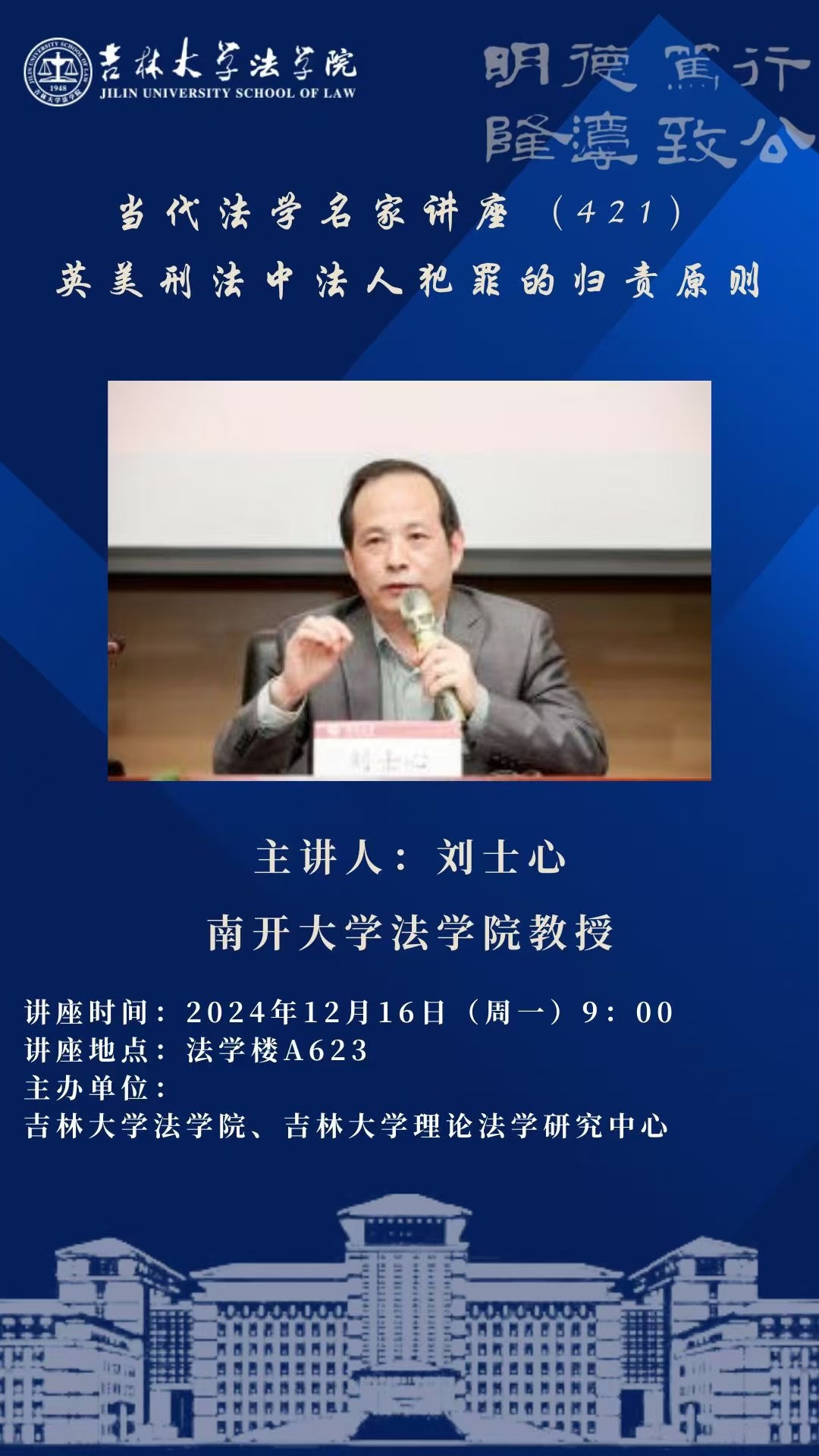 第421期当代法学名家讲座,讲座题目为“英美刑法中法人犯罪的归责原则”,讲座地点在法学楼A723。本次讲座由91论坛