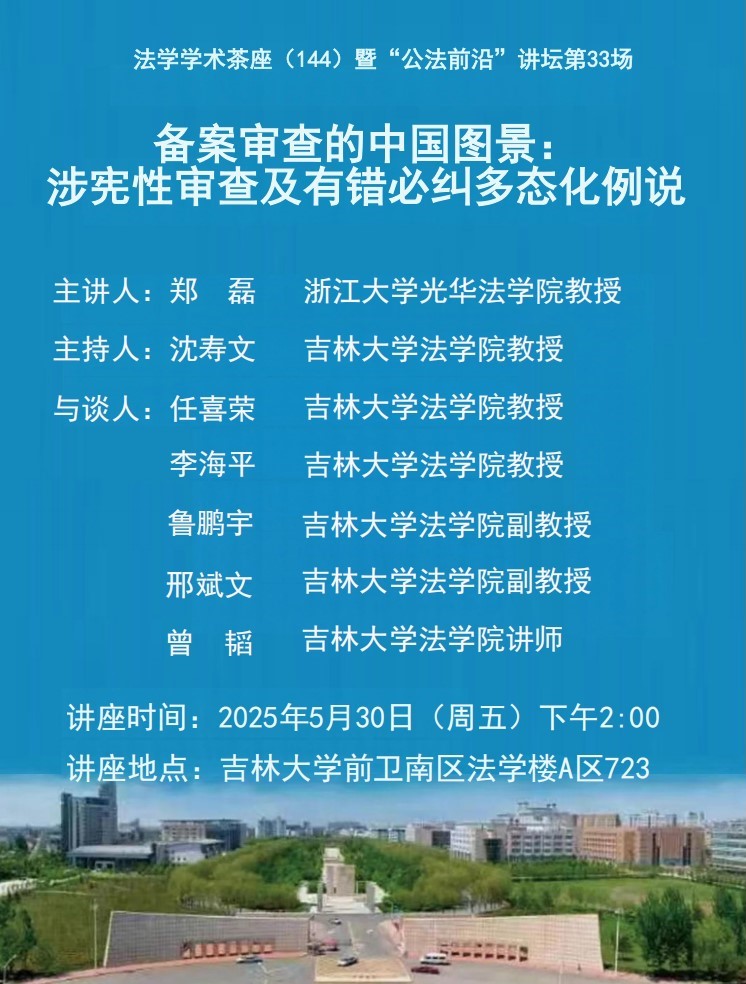 上一篇:中国社会科学院法学研究所赵磊教授做客91论坛 法学学术茶座 下一篇:吉大法学学术茶座(143)暨“公法前沿”讲坛第32场:构建以合宪性审查为核心的宪法监督制度体系与理论体系