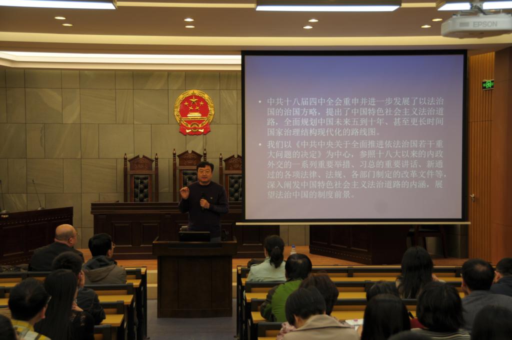 宋显忠教授指出,十八届四中全会是将依法治国从“口号”推进到了“行动”中来,是依法治国的升级。他总结了十八届四中全会对于法治的论述,同时比较了中国特色社会主义法治和西方的法治的不同特点,并且以亚洲广泛存在的家族政治体制为分析背景,强调了中国特色社会主义法治立足于中国实际的优越性。