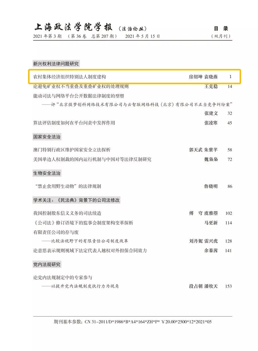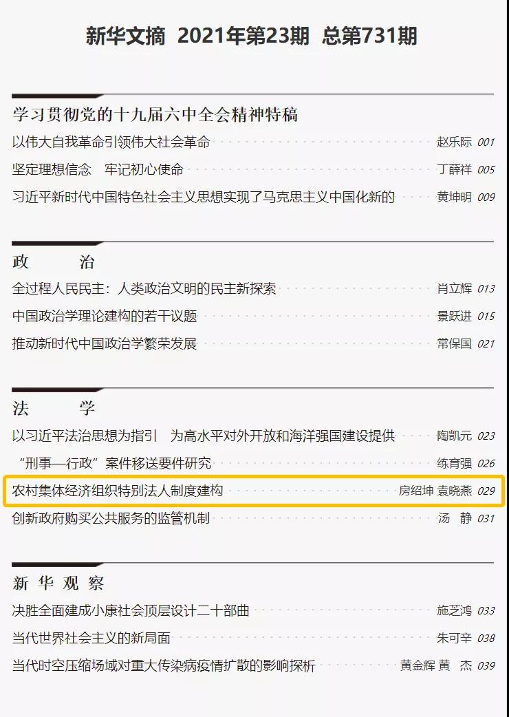 房绍坤教授发表在《上海政91论坛 学报(法治论丛)》2021年第3期的“农村集体经济组织特别法人制度建构”一文被《新华文摘》2021年第23期全文转载,该文是房绍坤教授带领团队致力于农村集体产权制度改革法治保障研究的阶段性成果。